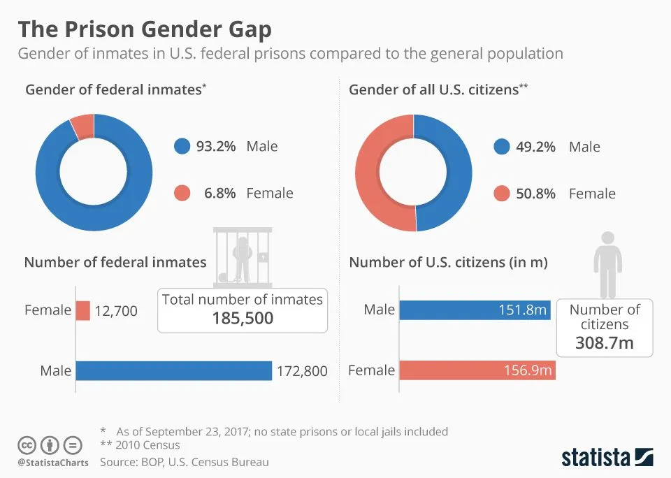 Men are 49.2% of the population yet 93.2% of the prison population are males. Obviously the system is biased against men.