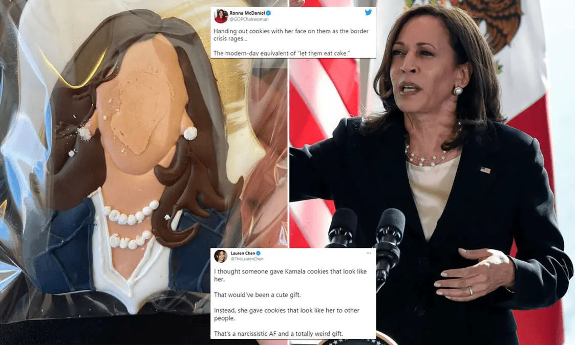 Kama Harris managed to pass out cookies during her first foreign tour of Central American countries ravaged by the border crisis. The VP gifted the treats - which featured a bust of her drawn in frosting without the details of her face - to reporters aboard Air Force 2 on Sunday as she set off for Guatemala.