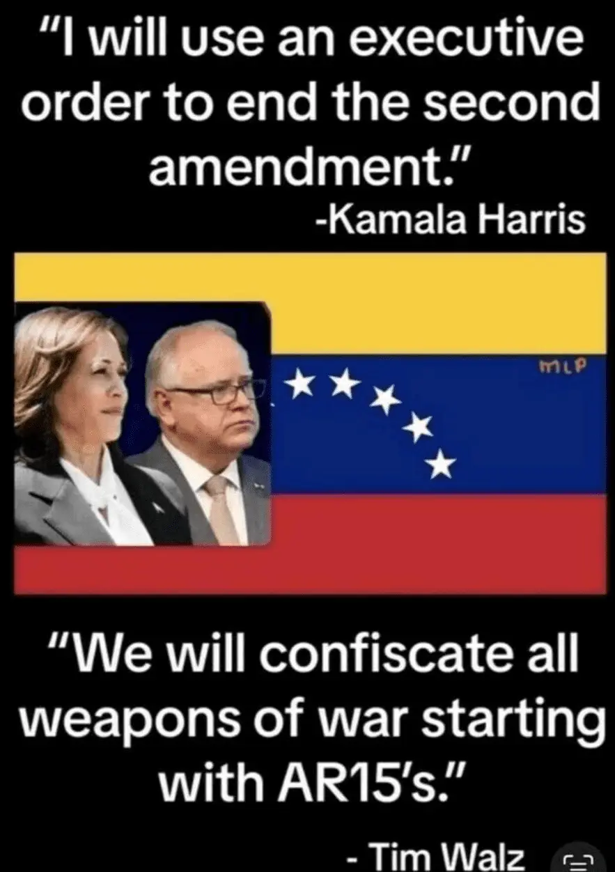 The Kamala/Walz’s desire to disarm law abiding American citizens of the kind of firearm a foot solder would use is an alarming signal, as the good people of Venezuela and Cuba have learned.