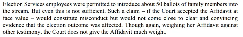 Read that again. The court didn't find misconduct. "The Court does not give the Affidavit much weight." That's legalize for we don't believe your ass.And as said from day one - the court found misconduct but stated it wasn't enough to alter the results,