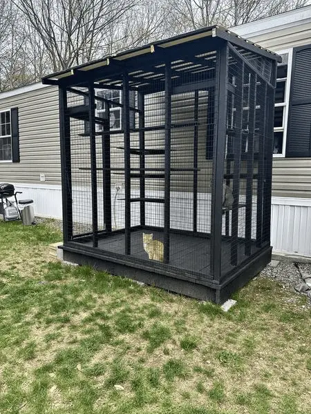 access to the cage thru a window, keeps cats safe from wilder animals and lots of room to play.