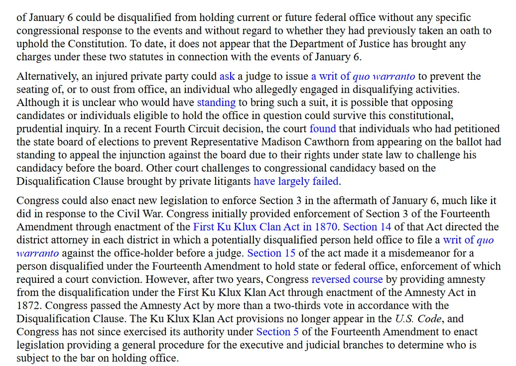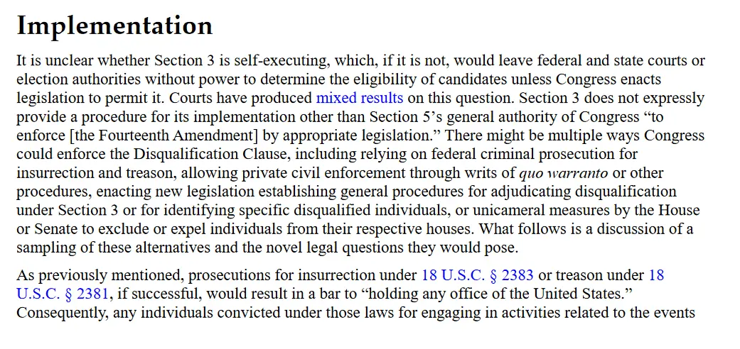 Six people were charged with sedition, four of whom were convicted. There were a very few of the J6 perps that had held federal office (I think) and those people are now ineligible for federal office ever again unless a 2/3rds majority of the Congress should opt to let them back in. And personally, I can't see that happening.But it -does- require an insurrection and/or rebellion.