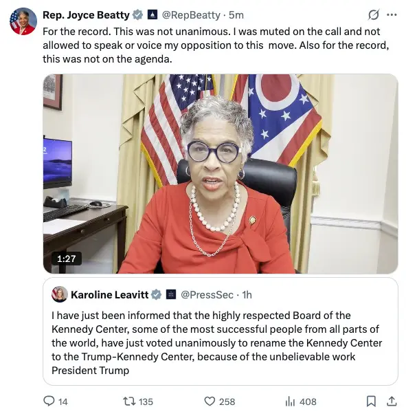 - The John F. Kennedy Memorial Center for the Performing Arts will be renamed the “Trump-Kennedy Center,” White House press secretary Karoline Leavitt said.