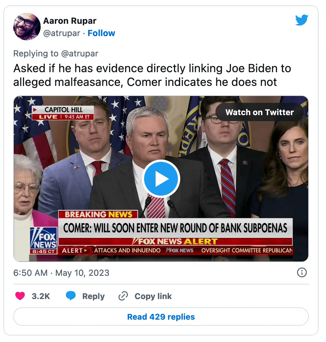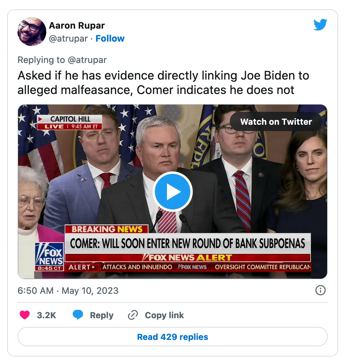 And its not my opinion that Comer has no evidence directly linking Joe Biden to any crime. Its Comer's.