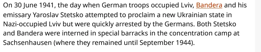 Stepan Bandera was locked in a death camp by the German National Socialists for the entirety of World War II in Ukraine . Even more,