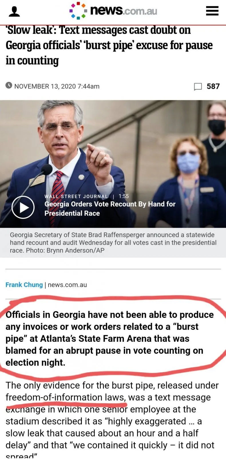 Officials in Georgia have not been able to produce any invoices or work orders related to a “burst pipe” at Atlanta’s State Farm Arena that was blamed for an abrupt pause in vote counting on election night.www.news.com.au