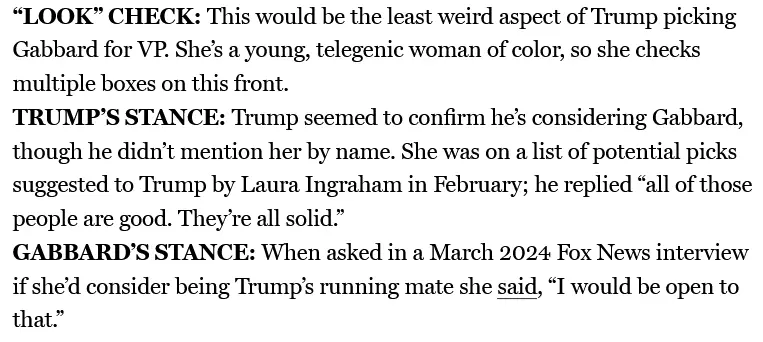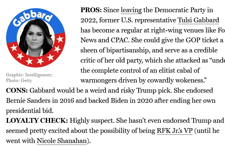 Tulsi turned down RFkjr./was turned down by?, so I'm thinking the WEF young global leader is on track to be Trump's VP.
