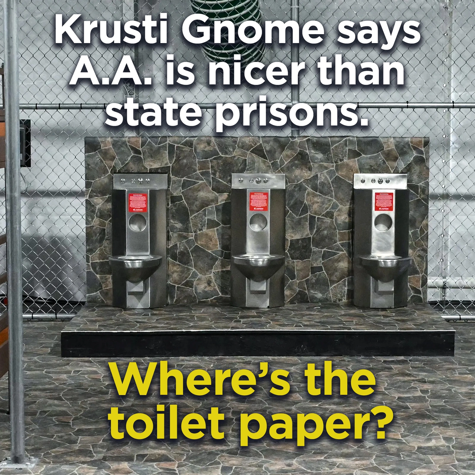 Well then, where's the toilet paper? What's the warning on those little red signs? Do state and federal prison cells make their inmates brush their teeth using the same water source that's in their toilets?