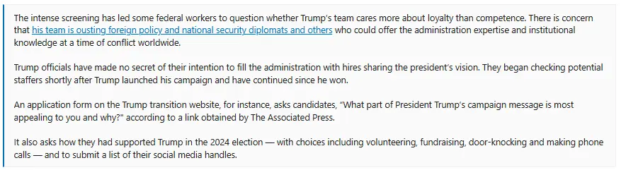 One official said he and several colleagues from various agencies had been told that even if they passed the initial vetting process to be admitted into the applicant pool, they would still need to prove their bona fides and convince interviewers of their “enthusiasm” to put in place Trump's policies, including by providing references from people whose loyalty had already been established.