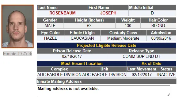 That was Joseph Rosenbaum, formerly known as Inmate 172556, who did time for multiple counts of sexual conduct with a minor and who was violent towards his guards while doing that time.