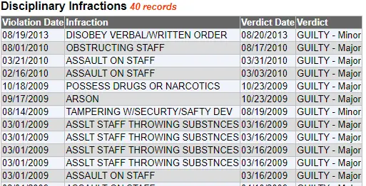 Here are just some of the 40 times he was violent or disobedient toward prison staff: