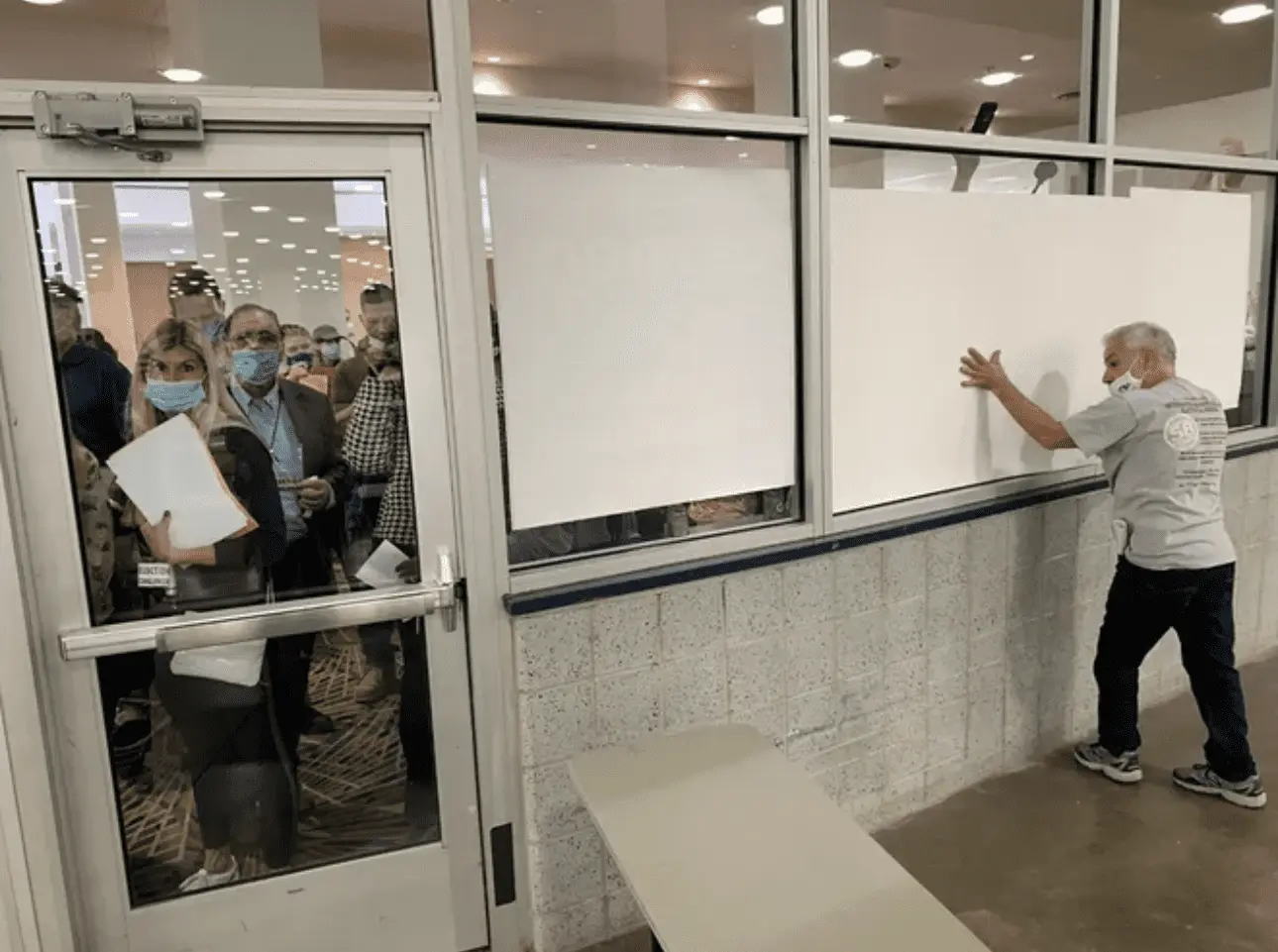 One jackass, a Republican observer, walked around in a full-face Guy Fawkes mask.....until ejected. As the disruptions persisted the authorities ejected the excess number of counters in order to get the numbers back down to a total of 268. Those ejected in that process and now outside the counting room began to bang on the windows and disrupt the process even more. The counters complained it was interfering with their work. Hence the taped-up paper screen on the windows.