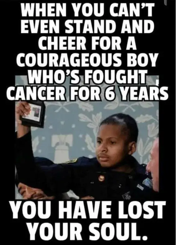 Why are you so racist you can't even clap for a little boy with brain cancer?Stop lying. You know this was not about that boy. So when you have a leader using a sick child as a prop, you have lost your soul.
