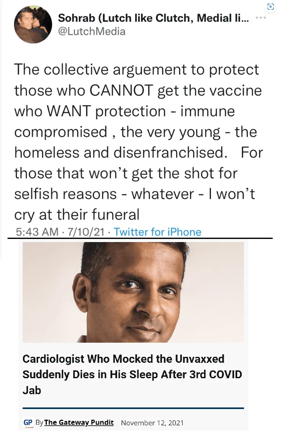 "Major corporate pollsters will not touch the topic", he says. This poll is on sudden death. They ask, "Do you personally know anyone whose death may have been caused by side effects of the Covid vaccine".