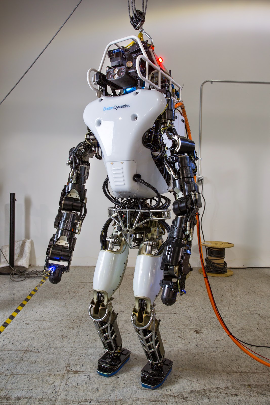 Teams are likely to keep their robots connected to fall arrestors during much of the remaining months of training as a safeguard against premature damage to the robot. DARPA demonstrated the new Atlas with a fall arrestor in place.