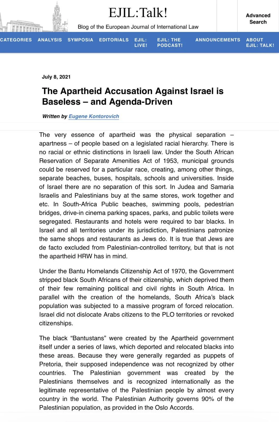 His speeches against apartheid returned obsessively to gross, licentious equations between the former South African system and Jewish practices, biblical and modern. "the Jews," Tutu declared in 1984, "thought they had a monopoly on G-d" and "Jesus was angry that they could shut out other human beings."