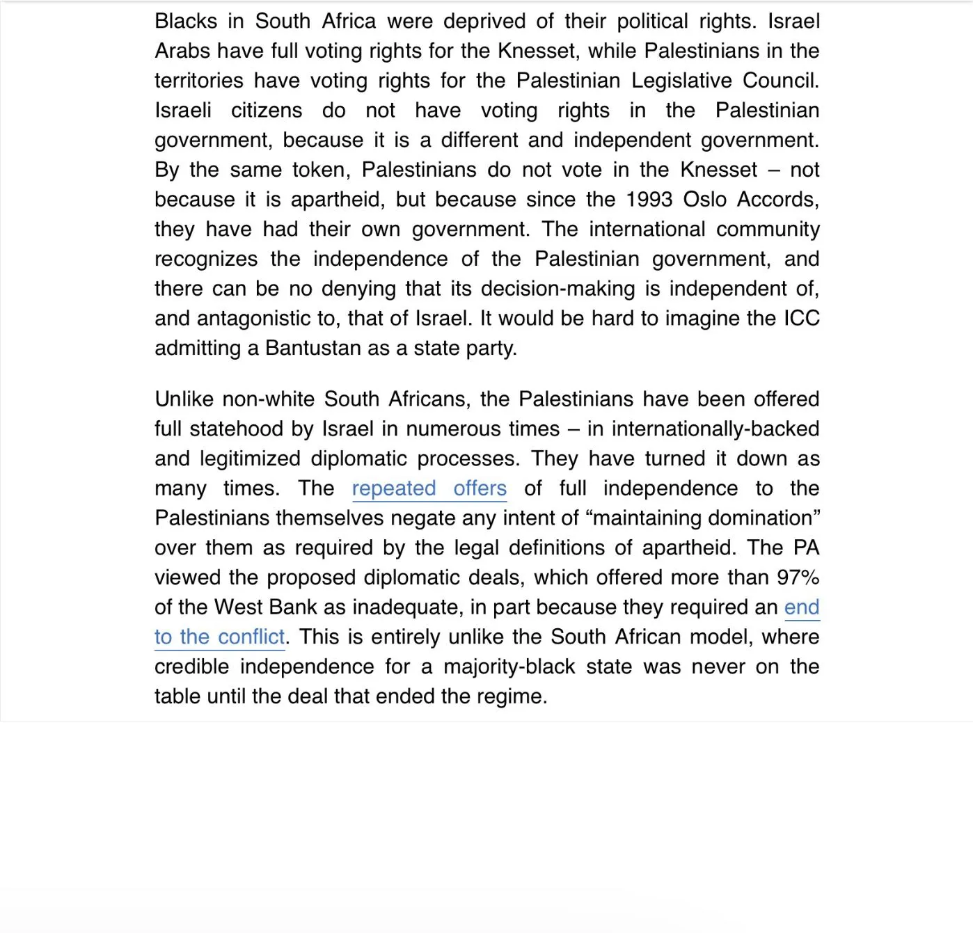 Desmond Tutu, the noted civil rights leader who became the first black archbishop of Cape Town, compared Israel's treatment of the Palestinians to the apartheid regime