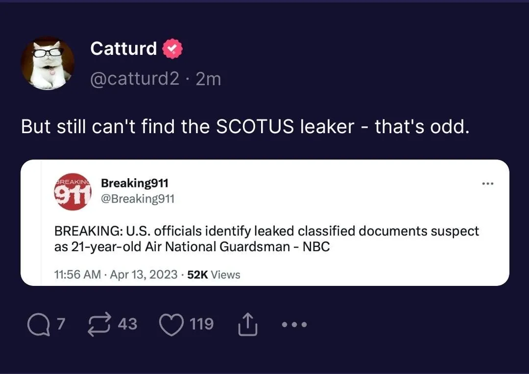 Isn't it amazing the Feds have no idea on who could have leaked information out of the Supreme Court even though there is a finite number of folks that could have done it. What's also amazing is they have no idea who leaked information out of Alvin Braggs office, even though there is a finite amount of folks that could have done that. But when it fits their agenda they know exactly who did the leaking.