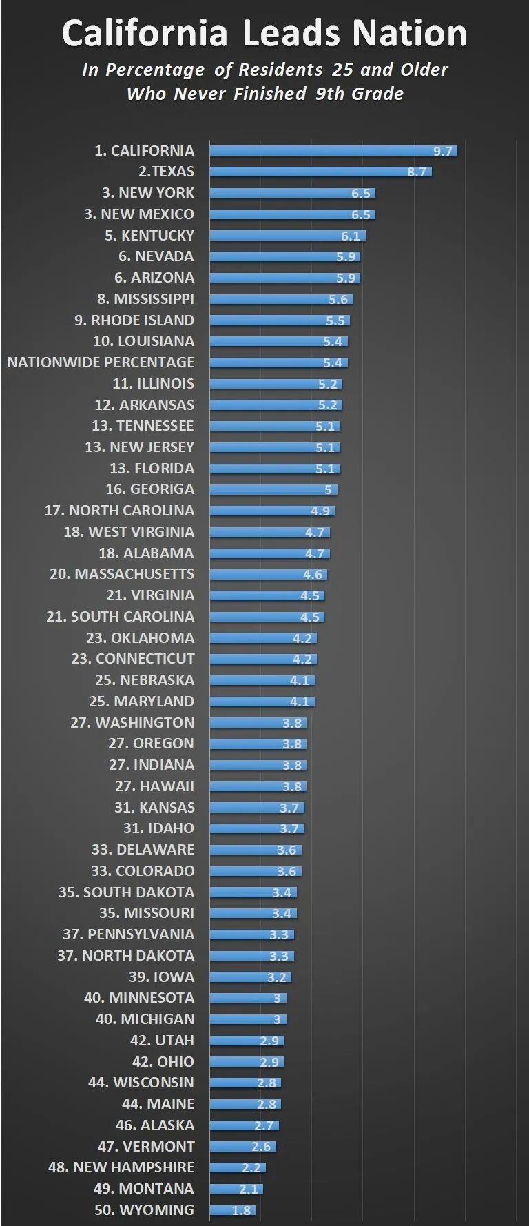 California ranks No. 1 among the 50 states for the percentage of its residents 25 and older who have never completed ninth grade and 50th for the percentage who have graduated from highschool, according to new data from the Census Bureau.