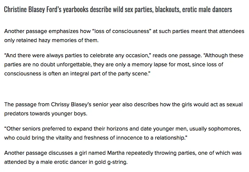 That is their job to figure out. You don't know there is no one to back up her claims until there is an investigation. This armchair investigating by me and you is all silliness.You know why--they do it as part of their background check. If you were responsible for a background check, completed it and then a bomb like this presented itself, would you not go back and check around for more information? OF COURSE YOU WOULD. Don't be arguing any different, 2AGuy, because it is the only sensible thing to do.Lie about being WHERE? Do we even know that yet? The neanderthals here are full of shit arguments, I agree with you, but Kavanaugh is most likely telling the truth as he remembers it, too.So youre saying that because he was drunk its ok for him to lie about being there? Does that really make sense to you?