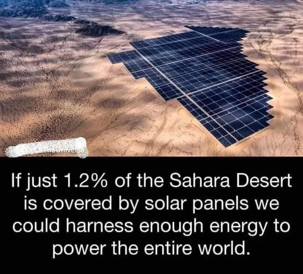 Lets cover 1.2% of the Sahara desert with solar panels and we could balance it out with a huge offshore wind farm over the Pacific and Atlantic. We could add 20 tw of battery storage too. This way we would never have to depend on fossil fuels again.