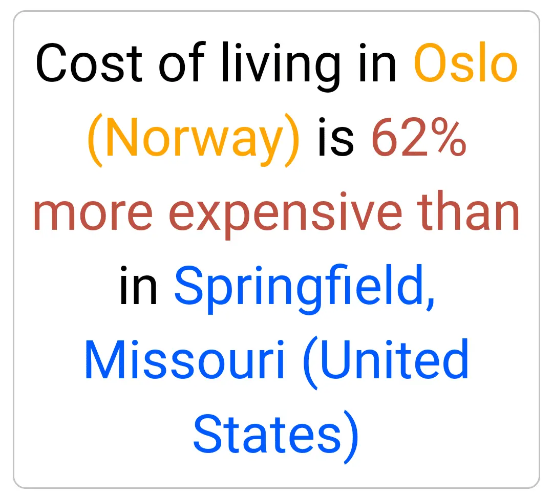 "Cost of living in Norway is more expensive than in 91% of countries in the World (9 out of 92)"