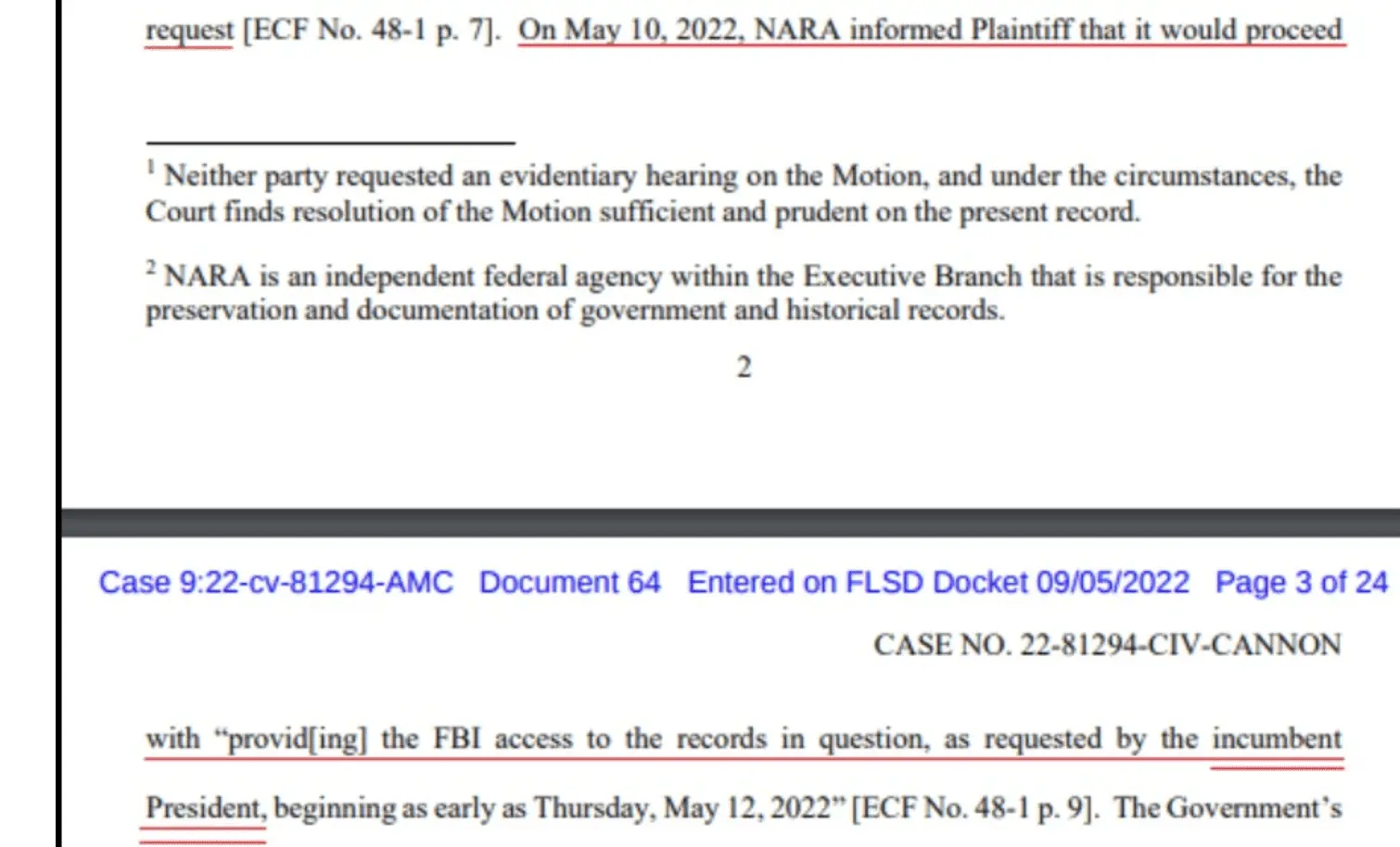 with “provid[ing] the FBI access to the records in question, as requested by the incumbent President, beginning as early as Thursday, May 12, 2022” [ECF No. 48-1 p. 9]. The Government’s filing states that the FBI did not obtain access to the Fifteen Boxes until approximately May 18, 2022 [ECF No. 48 p. 7].