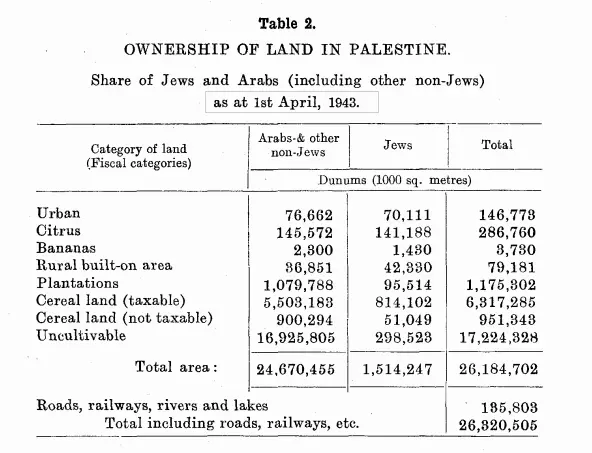 Table 2 depicts 26.4 million dunams of land. There are only 26.4 million dunams of land in ALL of Israel/"Palestine". Thus, you are claiming every single square meter of Israel/"Palestine" was privately owned, including 11 million dunams of DESERT. This is demonstrably not factual.