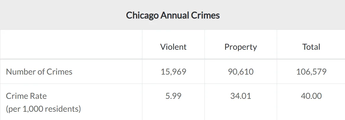 Most accurate 2021 crime rates for Chicago, IL. Your chance of being a victim of violent crime in Chicago is 1 in 191 and property crime is 1 in 30. Compare Chicago crime data to other cities, states, and neighborhoods in the U.S. on NeighborhoodScout.
