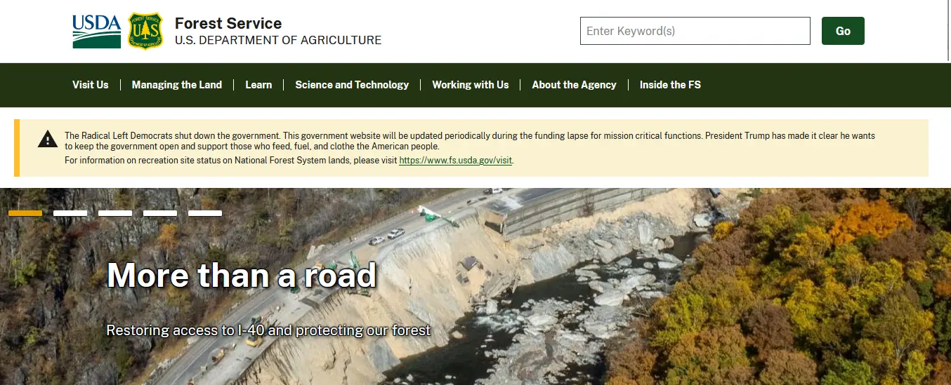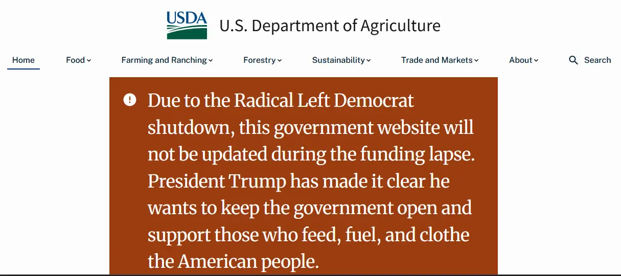 "The Radical Left Democrats shut down the government. This government website will be updated periodically during the funding lapse for mission critical functions. President Trump has made it clear he wants to keep the government open and support those who feed, fuel, and clothe the American people."