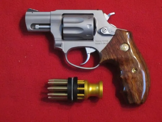 The grips on this are mango wood that I found somewhere on-line, and I got the Taurus medallions from a cheap set of plastic grips and used a forstner bit and inlaid them into these grips.