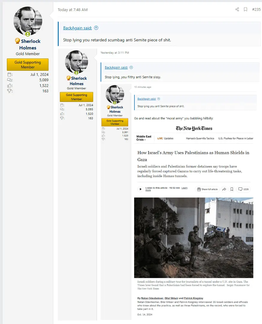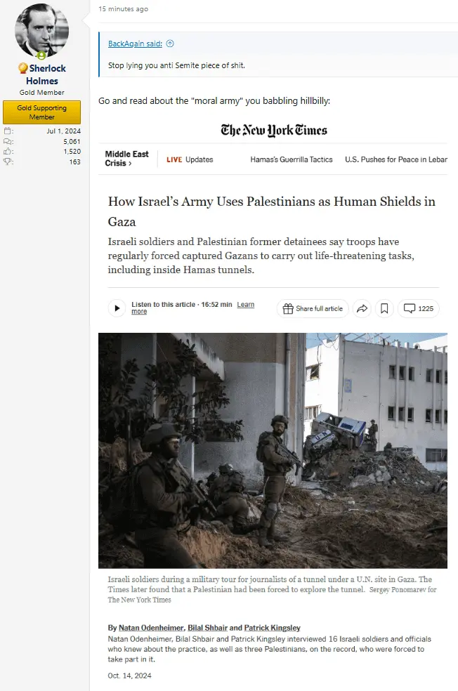 As I've said many times here, extremist Zionist agitators like you cannot distinguish between truth and lies, good and evil and right and wrong. That's why even when shown evidence of IDF human shields all you can do is mumble a "stop lying".Stop lying. Youre an anti Senite. Period. We all know it.