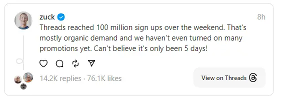 “Threads reached 100 million sign ups over the weekend. That’s mostly organic demand and we haven’t even turned on many promotions yet. Can’t believe it’s only been 5 days!” Meta CEO Mark Zuckerberg said in a post Monday"
