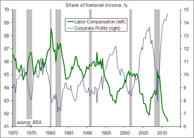 The second graph shows the corporate world's share of the National Income, notice the different directions comparing it to the working class's downwards trend. And it all started in the 80's.