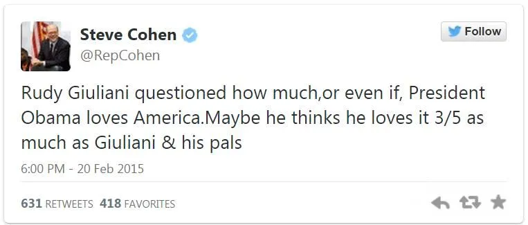 "Rep. Stephen Cohen (D-TN), who represents a majority-black district, tweeted that perhaps the former mayor thinks Obama loves America "3/5 as much as Giuliani & his pals."