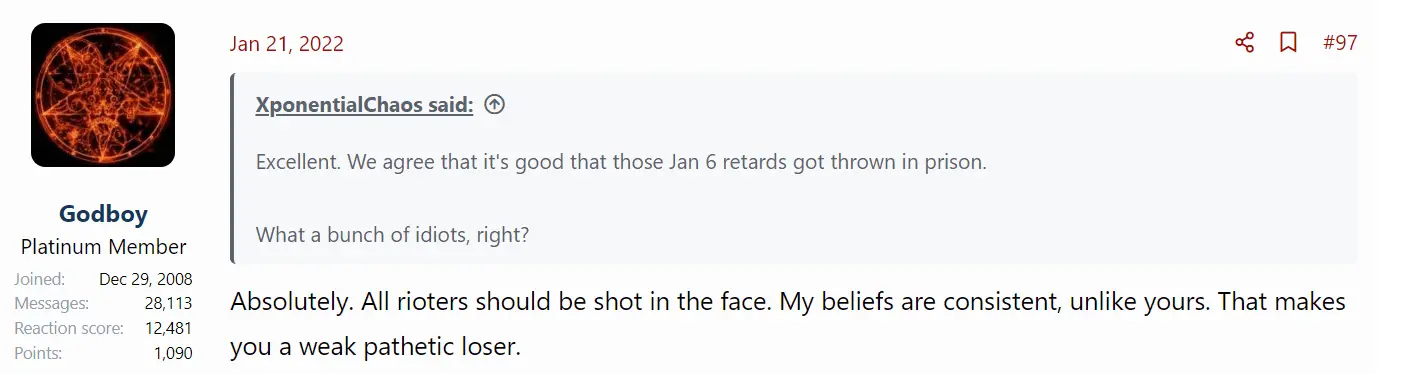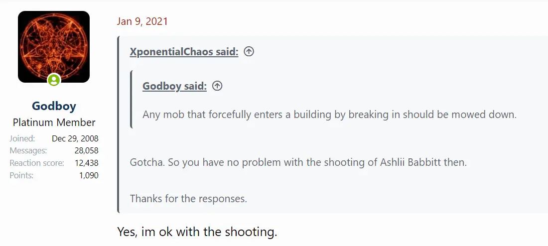 When I asked him about this before, he said that he was ok with the shooting of Ashlii Babbitt. He said he thinks that they should be "mowed down". He also said he thinks all Jan 6 rioters should have been shot in the face.