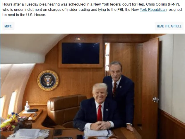 You are getting a little ahead of yourself. It is funny we hear about him, but Maxine Waters is in hot waters too-pun intended.I think you're totally Correctly are right.Trump’s first endorser.Is he Trump? No? I guess you can put the confetti back in the bag.Rep. Chris Collins, R-N.Y., is expected to plead guilty later this week to insider trading charges, court documents indicate, marking an about-face for the embattled lawmaker who pleaded not guilty earlier this month.
