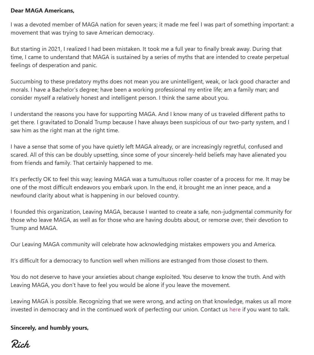 leavingmaga.org is here for your transition. I know it can be a difficult time for you but you are not alone. Millions of Americans are leaving MAGA and Rich understands how difficult that can be. He is a former dedicated MAGA conservative who walked away. I want my fellow posters here on USMB to have support if they need it. Below is a news article about the organization and a link to the site that can help you. Friends dont let friends deMAGA alone. They are here for you and no judgment by me.
