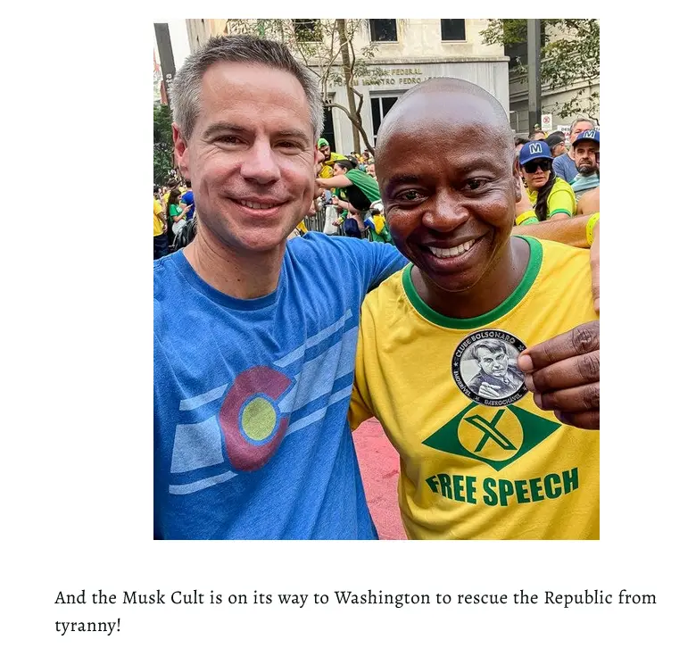 ". . . Which the New Normal Right is increasingly doing. Emboldened in large part by Elon Musk and other prominent “influencers,” they’re letting it rip with the blatant bigotry, and anti-Semitism, and neo-nationalism, and strutting around like racist bull roosters. Holocaust denial is trending. Rumors of cat-eating Haitians are circulating. Elon, who has been consecrated “Free Speech Incarnate,” is martyring Himself in Brazil and the UK. His disciples are flying around the planet, preaching The Gospel of Elon in their “Free-speech X” T-shirts, and passing out Bolsonaro stickers.