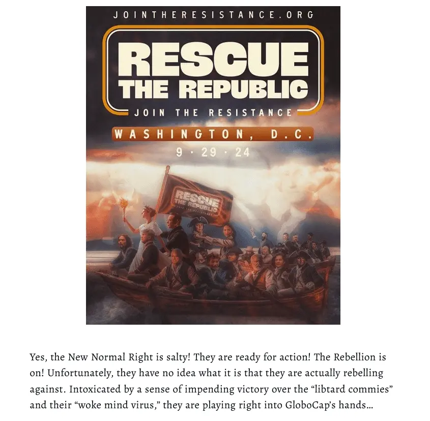 The catch is, most of the reactionary resistance is not quite scary and militant enough. I’m going to out on a limb here and state that most conservatives are not longstanding members of democracy-hating neo-Nazi militias. They’re just regular folks who want to be left alone to live their lives as they please, and to raise their families according to their values, just like most liberals — and, yes, even leftists — are not fanatical, mask-wearing, censorship-happy, shrieking, totalitarian freaks, but just regular people, with good intentions.
