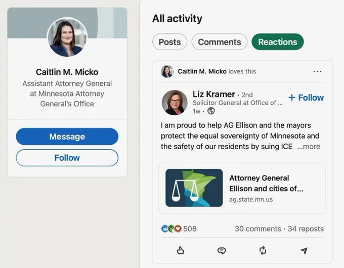 "NEW: I am told the judge that refused to sign the criminal complaint against Don Lemon is Magistrate Judge Douglas MickoHis wife works for Keith Ellison as an Assistant AG and has anti-ICE posts on LinkedIn"