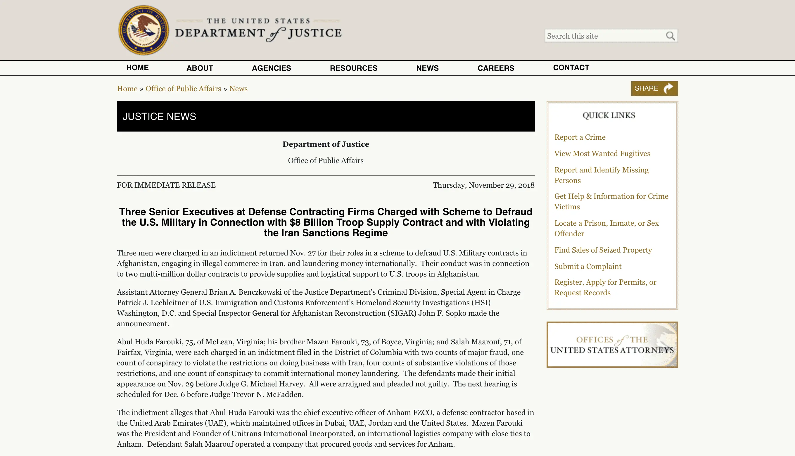 Assistant Attorney General Brian A. Benczkowski of the Justice Department’s Criminal Division, Special Agent in Charge Patrick J. Lechleitner of U.S. Immigration and Customs Enforcement’s Homeland Security Investigations (HSI) Washington, D.C. and Special Inspector General for Afghanistan Reconstruction (SIGAR) John F. Sopko made the announcement.
