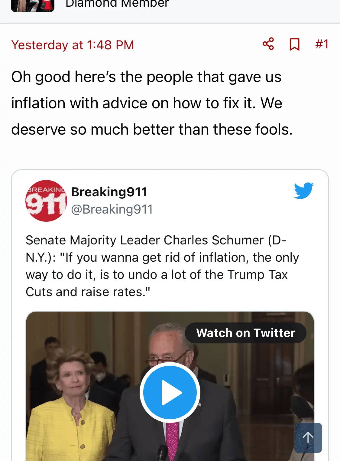 I've never liked Schumer but the Trumpanzees here seem to think all tax cuts are equal. I think what Schumer is saying is that we have an economy where workers are paying more for the same goods and services as they were before the dems passed their stimulus bill, and the 1% who own most of the equities and bonds are making more, and THAT is TRUE.Wow, could you imagine if he actually said that?