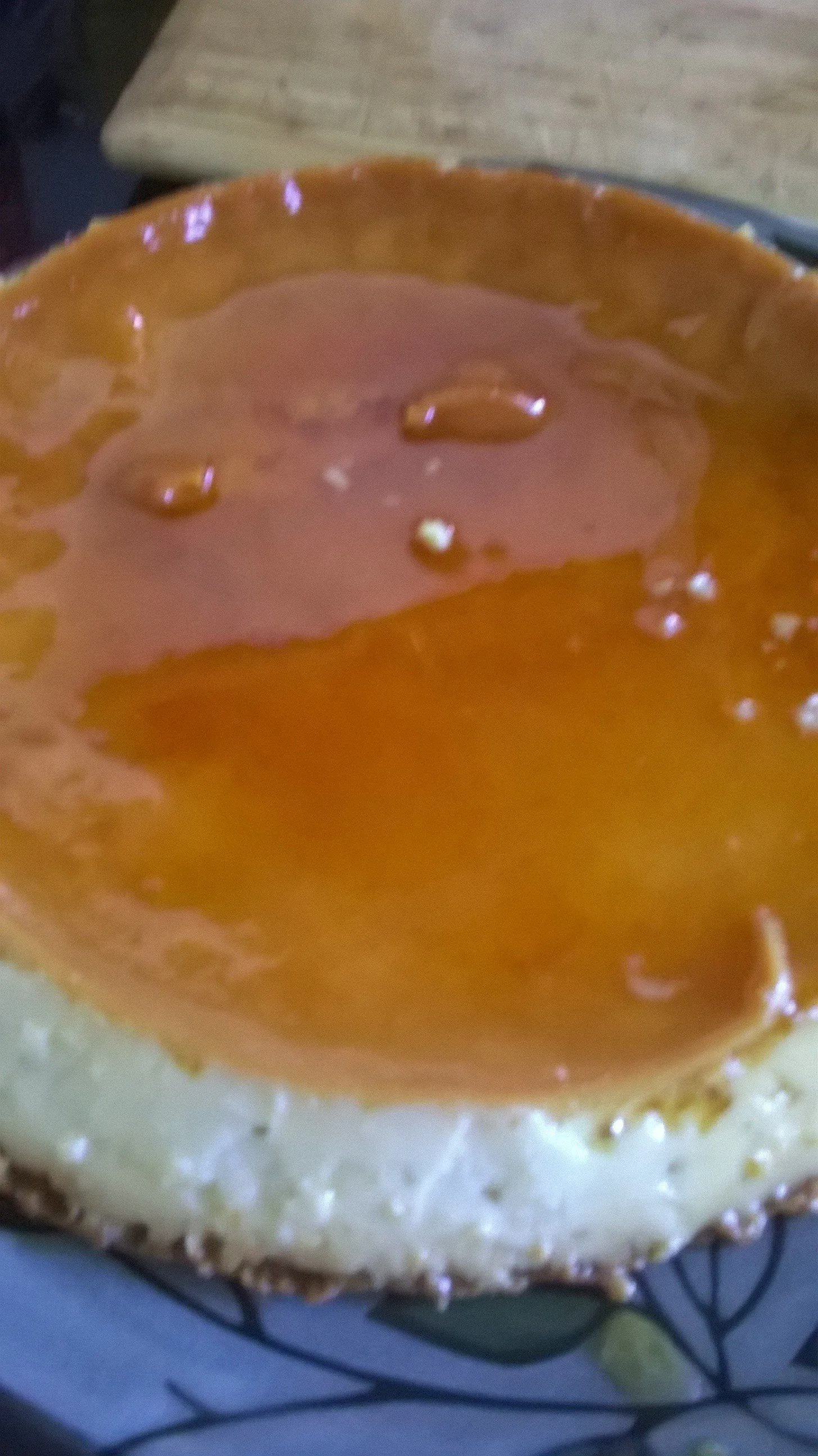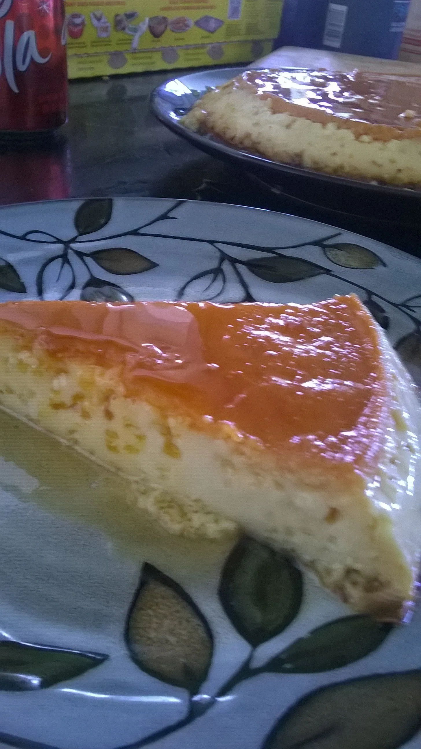 beat four eggs until completely mixed and smooth. Pour 2 cans evaporated milk and two cans condensed sweetened milk into large bowl, add a Ts vanilla and pour in the eggs and stir together thoroughly. Pour into pie plate on top of caramel. Put in oven in water bath for an you or so.