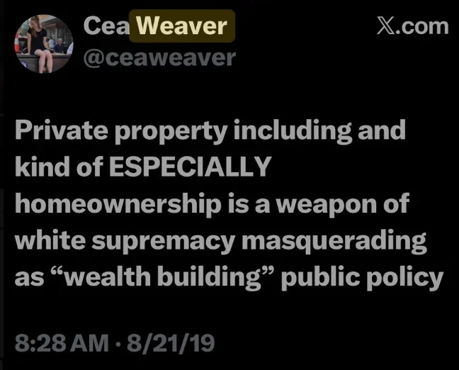 She has literally said “seize private property” and blasted homeownership as a “weapon of white supremacy” in a series of pro-Communist social media posts. (link)