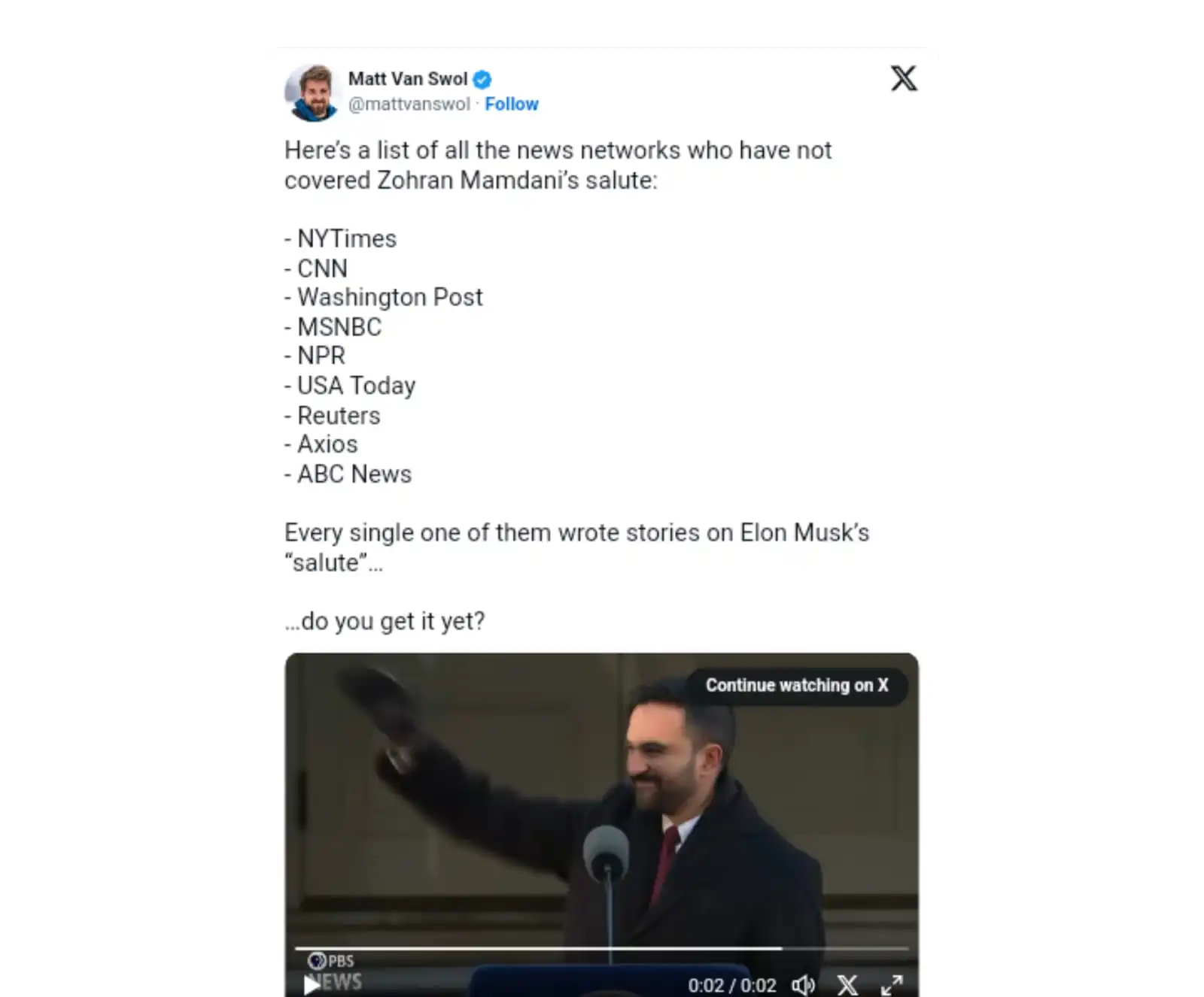 Here’s a list of all the news networks who have not covered Zohran Mamdani’s salute: