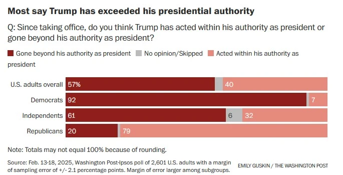 President Donald Trump has opened his second term with a flurry of actions designed to radically disrupt and shrink the federal bureaucracy, but reviews from Americans are mixed to negative on many of his specific initiatives, and 57 percent say he has exceeded his authority since taking office, according to a Washington Post-Ipsos poll.