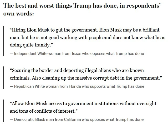The president’s supporters applaud him for deporting undocumented immigrants and cutting government waste. Those unhappy with the direction he is taking the country say they fear Trump is allowing billionaire Elon Musk to dismantle critical government programs.