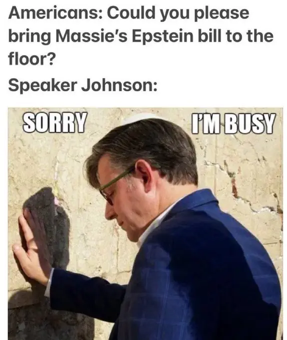 In that photo, Johnson is trying to explain to God why he is fully backing an unrepentant whoremongering adulterer, thief, and a lair who doesn't know the Ten Commandments from a donut.The RINO's and democrats aren't going to do anything about it. Most of them are on the AIPAC dole.