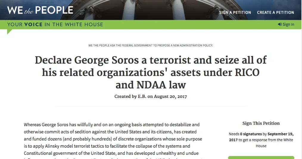 Declare George Soros a terrorist and seize all of his related organizations' assets under RICO and NDAA law | We the People: Your Voice in Our Government